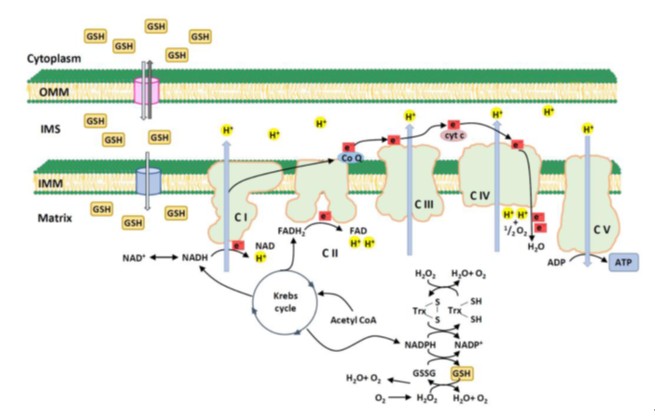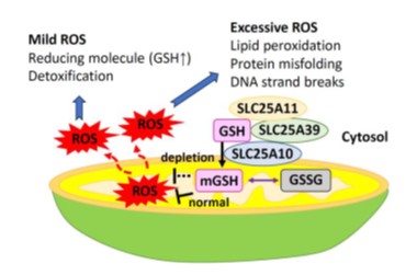 Glutathione (GSH) is one of the most abundant intracellular antioxidants. It is primarily synthesized in the cytosol and subsequently transported into mitochondria through specific carrier systems. Mitochondrial glutathione (mGSH) plays a critical role in detoxifying hydrogen peroxide and maintaining mitochondrial redox homeostasis. Persistent imbalance between mitochondrial ROS production and mGSH levels can impair mitochondrial function and trigger multiple forms of programmed cell death, including apoptosis, necroptosis, and ferroptosis.