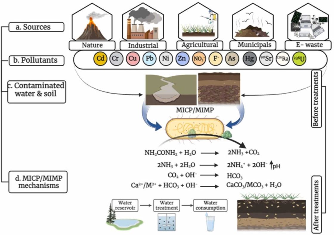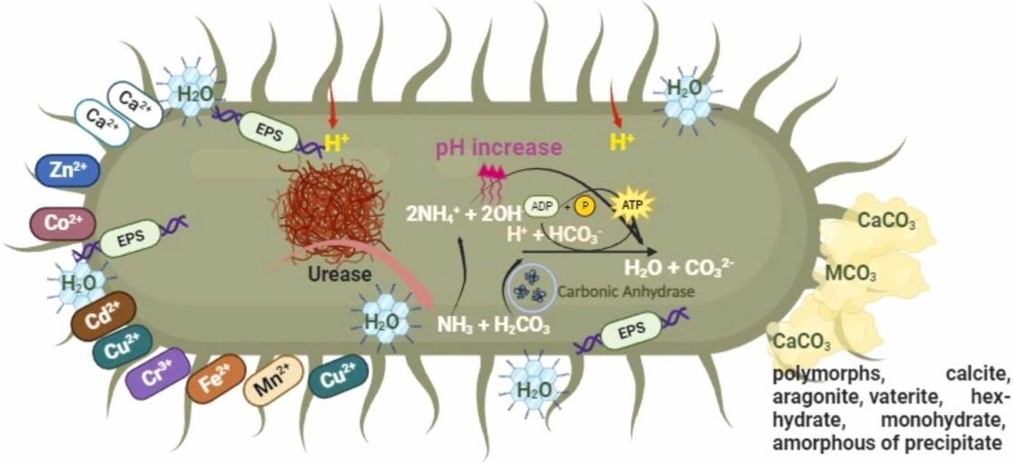 MICP is based on the natural metabolic activities of microorganisms that induce mineral formation. Certain microorganisms produce an enzyme known as urease, which catalyzes the hydrolysis of urea into ammonia (NH₃) and carbon dioxide (CO₂). This biochemical reaction increases the pH of the surrounding environment and promotes the formation of carbonate ions (CO₃²⁻). When calcium ions (Ca²⁺) or other metal ions are present, carbonate ions react with these cations to form carbonate minerals such as calcium carbonate (CaCO₃). These minerals can adsorb, encapsulate, or co-precipitate heavy metals and radioactive elements, transforming them into stable and insoluble mineral forms. As a result, the mobility and toxicity of contaminants are significantly reduced.